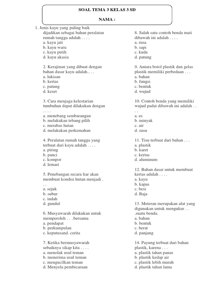 Penguatan Konsep Dasar: Kelas 3 adalah masa krusial untuk memperdalam pemahaman konsep-konsep fundamental dalam berbagai mata pelajaran. Matematika mulai mengenalkan operasi hitung yang lebih kompleks, Bahasa Indonesia memperkaya kosakata dan pemahaman bacaan, IPA mulai mengamati fenomena alam, dan IPS membahas tentang lingkungan sekitar serta sejarah sederhana. Kumpulan soal yang tepat akan membantu siswa mengulang dan mengaplikasikan konsep-konsep ini hingga benar-benar menguasainya.